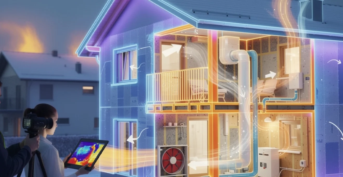 Au‑delà des transferts à travers les matériaux, une part importante des déperditions thermiques est liée au renouvellement d’air non maîtrisé du bâtiment. Les infiltrations parasites se produisent au niveau des joints de menuiseries, des prises électriques, des coffres de volets roulants, des trappes et de toutes les discontinuités de l’enveloppe. Cet air froid qui entre contraint le système de chauffage à compenser en permanence, augmentant la consommation énergétique sans améliorer pour autant la qualité de l’air intérieur.